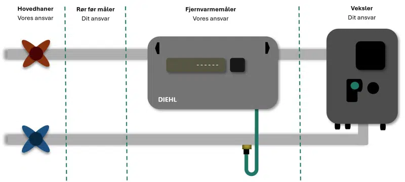 I den forbindelse skal måleren sidde så tæt ved hovedhanerne som muligt, så det er ens hvor afregningen sker fra.